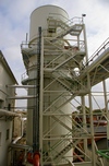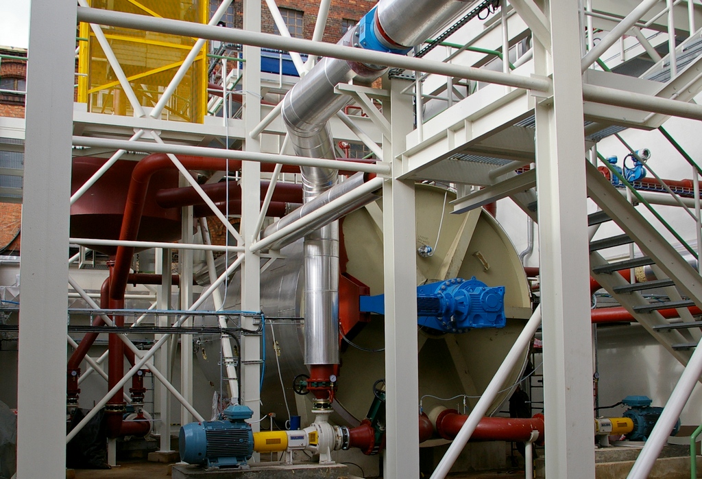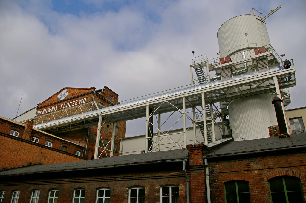 Zdjęcie pokazuje dyfuzor wieżowy wraz z konstrukcją pod taśmociągi wysłodków.
